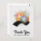 Ein Dankeschön an eine Postkarte mit einer Aquarellbild einer orangefarbenen Kamera mit Blumenstrauß und einem schwarz-weiß gewellten Filmstreifen.