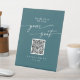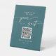 Dieses schicke, aquamarin blaue Sitzdiagramm QR-Code-Podest ist perfekt für eine minimalistische Hochzeit. Der kühne, dunkeltürkisfarbene Juwelenton des modernen böhmischen Designs zeichnet sich durch eine einfache rustikale Kalligraphie mit einem einzigartigen und dennoch klassischen Stil aus. Das Schild lautet "Bitte scannen, um Ihren Platz zu finden". Geben Sie Ihre Webadresse in den QR-Code-Bereich der Vorlage ein, und der QR-Code aktualisiert und verlinkt automatisch auf Ihre Website. Personalisieren Sie die Zeichen mit Ihren Namen und Hochzeitstag.
