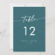 Diese schicken, aquamarinen blauen Hochzeitsfeiern sind perfekt für eine minimalistische Hochzeit. Der kühne, dunkeltürkisfarbene Juwelenton des modernen böhmischen Designs zeichnet sich durch eine einfache rustikale Kalligraphie mit einem einzigartigen und dennoch klassischen Stil aus. Das Design druckt vorne und hinten. Passen Sie Ihre Tischnummern mit Ihren Namen und Datum an. Personalisieren Sie jede Tischnummer, die Sie benötigen, und fügen Sie jede einzeln in Ihren Warenkorb ein.