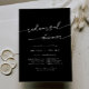 Diese schicke, farbenfrohe Dinner-Einladung zum Hochzeitsessen ist perfekt für eine minimalistische Probe vor der Hochzeitsfeier Probe. Das elegante und schicke dunkelschwarze moderne böhmische Design zeichnet sich durch eine einfache rustikale Kalligraphie mit einem einzigartigen und dennoch klassischen Stil aus.