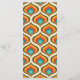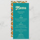 Boho chic 70er Jahre Thema, Menü-Karte. Template bietet Platz für Namen, Datum und drei Überschriften des Menüs mit Beschreibungen. Text in sandigem rustikalem Beige zur Koordination aquamarinen Hintergrunds. Rückseite der Kartenfeatures, trendy 70er Stil Muster in warmen Retro-Farbpalette.
