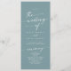 Dieses schicke aquamarine Hochzeitsprogramm mit Meeresfrüchten eignet sich perfekt für eine minimalistische Hochzeitsfeier. Das farbenfrohe blaugrüne, moderne böhmische Design besticht durch eine einfache rustikale Kalligraphie mit einem einzigartigen und dennoch klassischen Stil, der an den Strand, das Meer und die Sommerküste erinnert. Personalisieren Sie Ihr Hochzeitsprogramm mit Ihren Namen, Hochzeitsdatum, Ort, Reihenfolge des Dienstes, Hochzeitsfeier und optional in der liebevollen Gedenkstätte.