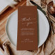 Cette carte de place en terre cuite chic et boho vous remercie est parfaite pour un mariage minimaliste. Le design moderne et bohème orangé terreux présente une calligraphie rustique simple, avec un style unique mais classique. Personnalisez votre carte de table de réception avec vos noms et une note attentive pour vos invités, votre famille et vos amis.