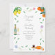 Schöne, moderne, farbenfrohe Hochzeitseinladung mit einfachen bohoboischen Botanicals, Orange und Zitronenzitrus, ideal für eine sonnige Sommerhochzeit. Zu den originalen Kunstwerken der Künstlerin Catherine Sweetman zählen Blattwerk, Wildblumen, Käse und Wein, musikalische Noten und Blasenflöten. Whimsical Handschrift und moderne Typografie-Skript mit leicht zu personalisierenden Vorlagen zum Hinzufügen von Namen, Datum und anderen wesentlichen Informationen zusammen mit den Braut- und Bräutigam-Initialen auf der Sektflaschenschild. Die Farbpalette umfasst Zitrone, Gelb, Orange, Grün, Blau, lila und Rosa.