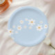 Baby in Bloom! Retro inspirierte tagelange Baby Dusche Teller mit 70er Jahren Stil Gänseessen und boho Schriftart und Farben.