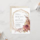 Elegante, einzigartige Blumenzettel mit Ihren Hochzeitsdetails, gerahmt von einem geometrischen Rahmen aus vergoldeten Imitaten mit bordeauxfarbenen Blume, lila, rot und korallenfarben, die reich an beige- und braunen Erdtönen sind. Die Einladung kehrt zu einem hellbeigen Aquarell-Hintergrund zurück.