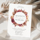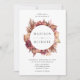 Elegante, einmalige Blumenzettel, umrahmt von bordeauxroten, lila, blüten und korallenfarbenen Blume und üppigem Blattwerk in kräftigen Beige- und Brauntönen. Personalisieren Sie die blumengeschmückten Einladungen, indem Sie Details wie Hochzeitsdatum, Uhrzeit, Veranstaltungsort und Empfang hinzufügen. Die Einladung kehrt zu einem hellbeigen Aquarell-Hintergrund zurück.