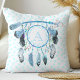 Blaue, indianische Federn und Perlen hängen von einem Pfeil mit einem Traumfänger in der Mitte. Weiße Mitte für eine Monogramm-Vorlage geöffnet. Geometrisches, Pfeil Kopf, Dreieck-Form Muster im Hintergrund aus türkisblauem Licht, das auf der Rückseite fortgesetzt wird. Vorlage wird für Sie erstellt.