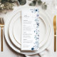 Boho Dusty Blue Navy Whimsical Fleur sauvage Elegant Simple Mariage Menu Modèle. Modèle de menu minimaliste à la fleur sauvage blanche de style bohème avec des fleurs bleues et marines poussiéreuses et des botaniques en aquarelle imprimée à la main. Menu modèle pour les mariages du printemps, de l'été, de l'automne et de l'hiver.