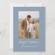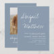 Dieses Boho Simple Elegant Dusty Blue und White Stylish Einladung mit Ihrer Nachricht und Details mit einem eleganten Foto auf der Rückseite personalisieren. Diese minimalistische Einladung beinhaltet stilvolle handgeschriebene Schriftzeichen mit moderner Farbe für die besondere Hochzeitstagsfeier.