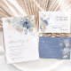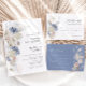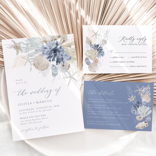 Boho Rustique Élégant Sur La Plage Bleu Dusty Simple Faire-part de mariage. Coquillages de bord de mer arrangés à la bohème invitation minimaliste avec boho élégant et simple bleu poussiéreux coquillages et coraux en aquarelle imprimée à la main. La couleur bleu arrière - plan est somptueuse pour les mariages boho et les mariages sur la plage. Invitations modifiables pour les mariages du printemps, de l'été, de l'automne et de l'hiver.