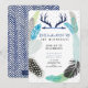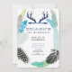 Boho Stamm Geburtstag laden mit blauen, grauen und neutralen Federn, Pfeile, Hirschantler schmücken. Eine Pow-Geburtstagsparty mit dieser Bohemischen Stammesfeier einladen