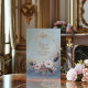 Invite your guests to a celebration of opulent romance and ethereal beauty with this exquisite wedding invitation. The design centers on a stunning central thin gold circular frame set against a soft, luminous pale blue and lavender backdrop. The frame is intricately detailed with ornate baroque scrollwork and highlighted by striking purple and pink gemstone accents. This entire composition is gorgeously framed by a lavish wreath composed of soft, layered beige and brown feathers, accented by pristine white and soft pink daisy-like flowers. The aesthetic beautifully merges the earthy, organic texture of feathers with rich, antique metallic accents, perfectly setting the stage for a luxurious, stylish, or celestial-themed wedding. This invitation card is ideally suited for a bohemian style wedding, a chic formal engagement celebration, or an elegant celestial-themed party. It would also perfectly suit a sophisticated winter destination event or a serene, elegant vow renewal ceremony.