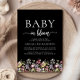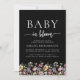 Une belle bordure florale d'aquarelle fleur sauvage décore le bord inférieur de cette invitation à baby shower boho tendance. Les mots "Baby in florom" apparaissent dans les polices serif et script, avec des swashes avant et après le script. Personnalisez le texte avec le nom de la future maman et les détails de la douche en blanc sur un arrière - plan noir. Le dos de la carte est noir.