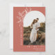 Eine moderne Hochzeit bewahrt die Dattelankündigung mit Ihrem Lieblings-Foto in einem Bogen auf Terrakotta-Hintergrund mit einer weißen Linie gezeichnet Blumenstrauß hinter dem Bogen. Fügen Sie Ihre Hochzeitswebsite QR Code auf der Rückseite.