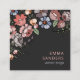 Handgemalt Stil whimsical vivivid Blumen blüht auf einer schwarzen, einzigartigen quadratischen Visitenkarte mit Ihrem Namen und Titel. Pfirsichfarben, Rose, Grün, Blau und Pastellviolett. Passen Sie die Einstellungen auf der Rückseite der Karte an. Ihr Name und Titel sind farbig, ein Social Media Icons auf der Rückseite in einem pfirsichfarbenen Rosa, um den Floralen zu entsprechen.