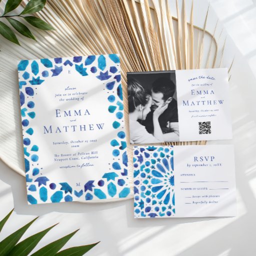 Mit unserer exquisiten Hochzeitssuite bringen Sie Ihre Gäste zu den sonnenverwöhnten Küsten des Mittelmeers. Die marokkanischen und spanischen Fliesenmotive, die in lebhaften Blautönen gestaltet sind, schaffen eine rustikale Eleganz, die sich perfekt für eine Hochzeit in Urlaubsort oder eine Feier mit dem Thema Küste eignet. Die Aquarelldetails und der elegante Script-Schriftart verleihen dieser Einladungssuite ein Gefühl von Ruhe und Eleganz. Dieses einzigartige Design wird Ihre Gäste begeistern und sie mit Spannung verlassen, um Ihren besonderen Tag zu antizipieren.