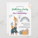 Ein charmantes Design mit einer lächelnden Giraffe, Geschenken, einem blauen Regenbogen und eleganter Kalligrafie (das erste "Geburtstagswort" hat ein kleines Herz)! Sie können diese Einladung mit Ihren eigenen Daten personalisieren.