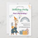 Ein charmantes Design mit einer lächelnden Giraffe, Geschenken, einem blauen Regenbogen und eleganter Kalligrafie (das erste "Geburtstagswort" hat ein kleines Herz)! Sie können diese Einladung mit Ihren eigenen Daten personalisieren.