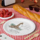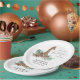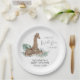 Boho Baby Duschpapier Teller mit Aquarellen einer Giraffe, tropische Blumen und Salbei-Grün-Monstera und Farn-Blätter. "Ein süßer kleiner Wilder ist auf dem Weg" ist in einer Mischung aus lustiger Typografie und einem stilvollen Drehbuch geschrieben.