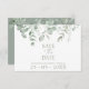 Boho Greenery Foliage Eukalyptus Wedding Save the Date Card. Stilvoll beeindrucken Sie Ihre Hochzeitsgäste mit dieser elegant gestalteten Hochzeitskarte, die mit schönen grünen Eukalyptus-Blätter auf weißem Hintergrund rette. Diese Hochzeitskarte rette-the-date und bietet ein wunderschönes grünes Blattdesign mit rustikalen und botanischen Farbtönen, die sich perfekt für Ihre Hochzeit im rustikalen, grünen oder eukalyptusartigen Stil eignen. Die minimalistische und moderne Einrichtung verleiht dem üppig grünen, eleganten Eukalyptusblatt-Set einen minimalistischen Hintergrund mit einem zarten, dunkelgrünen Schriftart. Diese Hochzeitskarte rette den Ton für eine wunderschöne Hochzeitslandschaft, umgeben von Silbergrün oder schlauer grüner Hochzeitsdekoration. Eine perfekte Ergänzung zu jeder botanischen oder rustikalen Feier.
