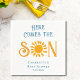 Niedliche Baby-Dusche-Papierserviette mit Aquarellbild einer gelben Sonne und "Here kommt the Son" in stilvoller Retroblau Typografie. Ideal für eine Babydusche. Einfach anpassbar. Original Wasserfarbe © Michele Davies.