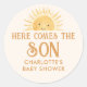 Dieser Babyduschaufkleber mit dem Thema "Here Comes The Son" in stylischer Typografie mit niedlicher, gelber Wasserfarbensonne auf weichem cremefarbenem Hintergrund. Einfach anpassbar. Original Wasserfarbe © Michele Davies.