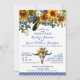 Bohemischer inspirierter Hochzeitseinladungs-Kartenmit blumenentwurf mit dem Watercolor Longhorn-Kuhschädel mit Federn, Sonnenblumen, wilden Blumen und blauer Gingham-Karogrenze.