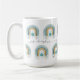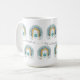 "BOHO Moderne Regenbogen-Sonnencreme-Wasserfarbe auf der rechten Seite in Blau-und Gold-Kaffee-Tasse." Beginnen Sie Ihren Tag mit Sonnenschein und Regenbögen und dem inspirierenden Text "Look on the bright" in der Schriftzeichen-Kalligrafie. Einfaches modernes Design mit Aquarellmalung von Regenbogen, Sonne und Herz in staubblau, aqua, aquamariner Marine, grau und Senfgold gelb. Kunst von international lizenzierter Künstlerin und Designerin, Audrey Jeanne Roberts, Copyright.