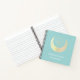 Ein elegantes Notizbuch mit einer holografischen Illustration aus Imitaten aus Goldfolie, die einen dritten Blick über den Halbmond mit Blätter auf einem zauberhaften aquamarin blauen Hintergrund verziert. Personalisieren Sie den Text mit zwei Zeilen benutzerdefiniertem Text unten. Koordination mit der dritten Eye Moon Business Collection für Yoga-, Reiki-, Wellness-, Tages-Wellness-Center- oder Spirituosencoach,