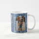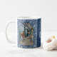 Festlich blaues Boho-Muster, 2 Foto Familienurlaub Tasse. Das Design verfügt über zwei Foto-Bereiche mit Bogenrahmen, das Logo "Bright and Merry Word-Art", Textlinien für Familienname und Jahr.