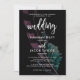 Romantische boho schicke Hochzeitseinladung mit bunten Federn und einem schwarzen Hintergrund.