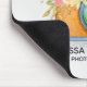 Personalized mousepad with a watercolor illustration of an orange camera and a floral bouquet resting on top. The flowers in the bouquet are light pink and orange with green leaves, a pretty floral arrangement. Light gray background.