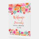 L'amour est en fleurs ! Boho orangé fleurie nuptiale bienvenue signe transparent avec joli peint à la main de fleurs orange, rose et jaune aquarelle illustration avec une police de script élégant moderne disant avec feuillage bohème verdure. Parfait pour le printemps, l'été en plein air jardin nuptiale ou mariage.