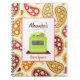 Un carnet de recette comportant une illustration d'un rétro fourneau vert clair à l'intérieur d'un rectangle au-dessus d'un arrière - plan de rose, de vert, d'orange, or, et Bourgogne Paisley. Personnalisez avec votre nom.