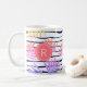 Arc-en-ciel coloré ombragé feuille de palmier tropical et motif rayé, mug de café monogramme avec monogramme rond en coordination rose.