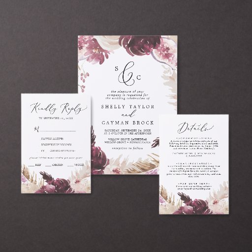 Diese Boho Pampas Gras-Menü UAWG Postcard ist perfekt für eine Hochzeit im Sommer. Das Blumenmuster in Aquarellfarben ist mit böhmischen bordeauxroten und rot-rosa Blume mit Spitzen aus neutralem Pampasgras und goldgetrockneten Palmen-Blätter gestaltet. Diese Hochzeitskarte frage den Gästen bequem, was sie am Empfang essen möchten.