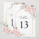 Boho Blush Pink Rose Blumenstuhl Grüne botanische Gold Arch Elegante Hochzeit Tischnummer. Bohemisch rosa Rosenbraut mit goldgelbem Bogen-Tischnummer-Schablone aus Imitaten mit eleganten und rot-grünen Blumen und botanischen Grünpflanzen in handgedruckter Aquarell. Das rötlich-rosa Aquarell eignet sich perfekt für romantische Hochzeiten und Hochzeiten mit rosa Blumen. Einfache, druckbare Vorlage für Frühjahr, Sommer, Herbst (Herbst) und Winterhochzeiten.