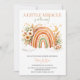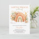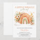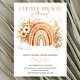 This design features a baby shower theme "A Little Miracle Is On The Way" with a hand-painted watercolour rainbow in soft terracotta, sage green, blush and warm neutral tones, this design blends Scandinavian minimalism with timeless boho charm. Flower, clouds and celestial accents. This invitation can be easily personalised with your personal event details.