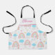 This is cute personalized apron for girls featuring boho rainbow pattern with clouds, hearts ,stars and colorful raindrops designed in pastel pink and blue muted colors. add your girl name using personalize template