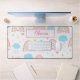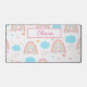 This is cute personalized desk mat for kids featuring boho rainbow pattern with clouds, hearts ,stars and colorful raindrops designed in pastel pink and blue muted colors. add your girl name using personalize template