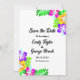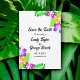 Diese elegante tropische Hochzeit speichern Sie die Dattelinie ist perfekt für eine moderne Sommerhochzeit. Das schlichte Design zeichnet sich durch gelbe, lila und rosa Blume mit eleganter schwarzer Typografie auf weißem Hintergrund aus.
