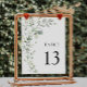 Boho Sage Grüne botanische Olive Elegant Simple Wedding Tischnummer. Bohemisch gestaltete botanisch minimalistische Vorlage mit eleganten und schlichten Salbeigrün Botanicals in handgedruckter Aquarell. Die schwarz-weiße Stimmung ist prächtig für minimalistische Hochzeiten und grüne Hochzeiten. Editierbare Vorlage für Frühjahr-, Sommer-, Herbst- und Winterhochzeiten