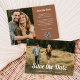 Diese trendige und Vintage Hochzeit speichern die Dattelkarten mit Retro-weiße Schrift auf der Vorderseite als Overlay auf Ihrem Foto. Die Rückseite hat einen braunen Terrakotta-Hintergrund und Elfenbeincreme-Text, und ein anderes Foto, zusammen mit einem scannable QR-Code, um Ihre Hochzeitswebsite hinzuzufügen.