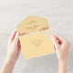 Eine Hochzeitseinladung im böhmischen Stil mit erdigen Tönen, Elfenbein und sanften gelben Farbtönen. Das Design zeigt ein romantisches goldenes Seil-Herz in der Mitte, das Einheit und Liebe symbolisiert. Einfache, elegante Kalligraphie-Skripte sorgen für ein romantisches Ambiente. Die Einladung enthält UAWG und einen eleganten Link zur Hochzeitswebsite. Die Rückseite der Einladung ist handadressiert und fügt eine persönliche Touch hinzu. Das Gesamtdesign sollte sich Bio und intim fühlen, mit einer Mischung aus zeitloser Eleganz und moderner Einfachheit, die perfekt für eine Frühjahrsfeier geeignet ist.