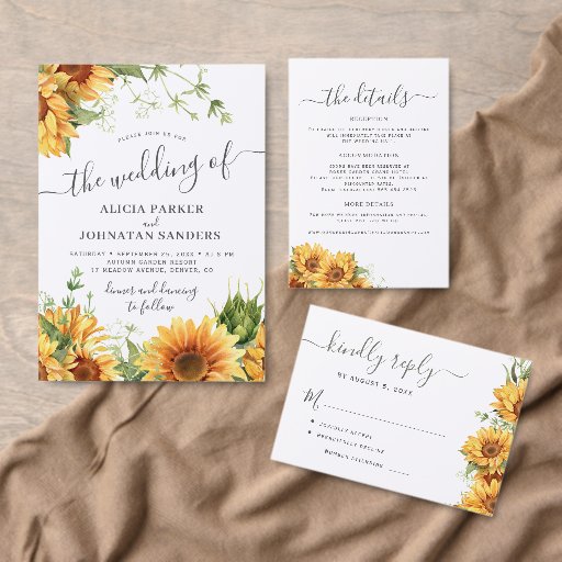 Boho summer sunflower garden black white wedding RSVP karte