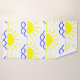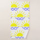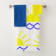 Dieses Handtuch-Set hat ein Badetuch mit einem Boho-Design von Halbkreisen mit Linien, um eine Sonne und Jakobsmuscheln zu machen Wasser, ein gelbes Waschlappen und ein blaues Handtuch.