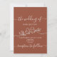 Elegante, schicke, moderne, minimalistische, gebrannte orange Terrakotta Hochzeitseinladung mit BackFoto, einzigartiges handgezeichnetes Paar liebt Vögel und trendige handgeschriebene Kalligraphie-Schrift.