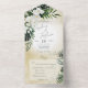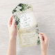 MIT ODER OHNE ABENDESSEN. AUCH MIT EINEM QR-CODE IM UAWG BEREICH VERFÜGBAR. Dieses Design besticht durch eine wunderschöne tropische Vegetation und weiße Blumen auf einem sanften, gelben, wasserfarbenen Hintergrund. Ideal für die Ziel- oder Strandhochzeit. Erstellt von der einfachen Farmhouse Press.