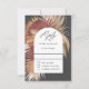 Un beau mélange de palmiers éventails séchés tropicaux encadrant votre texte dans un cadre arqué géométrique populaire ajoute un attrait distinctif à cette carte de réponse de mariage. La palette de couleurs neutres chaudes est un choix polyvalent tout au long de l'année et est particulièrement charmante pour les mariages d'été ou d'automne. Montré ici sur un fond gris charbon, d'autres couleurs sont disponibles. Personnalisez le modèle de texte avec la date de RSVP requise.